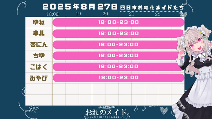 にと@2l0nym·8月25日26日いまつჱ̒^ ̳ ̫ ̳^引用《岡山コンカフェ》ダークメイデン@DMaiden_okayama·8月25日.⟡⚜️8/25~8/31お給仕予定表⚜️⟡. 営業時間꒰19:00〜L꒱ ⋆⸜♱⸝⋆御来館お待ちしております⋆⸜♱⸝⋆ #ダークメイデン #コンカフェ #岡山コンカフェ2307