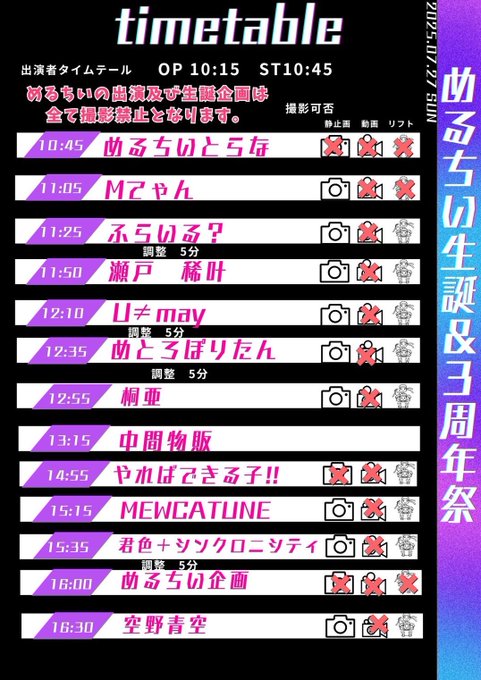 IDOLcafe&Bar くえすちょん?|コンカフェ富山|アイドルライブ毎日開催中🎤さんがリポストとうた🍨くえすちょん?出勤固定ツイ@QQQ_touta·23時間ついに今週末♡♡ くえすちょんは17:00〜の出演です🎤 みんなで一緒に盛り上がろうねヾ(・ω・)ゞ 久しぶりのライブ楽しみ☺️☺️引用めるちい🍫7/27生誕ソウルパワー@melchiikiss·7月21日めるちい生誕&3周年祭🍫🍫🍫 タイムテーブル発表です❣️ めるちいは10:45-、16:00-、17:45-(コラボ1曲) 、18:25-の4回出演します> ̫< ♡ 中間物販は生誕Tシャツ、終演後物販は生誕衣装で出ます❗️ あっついし長丁場だから暑さ対策、水分補給、適度に休憩してね🥹 よろしくお願いします💗💗💗2427929