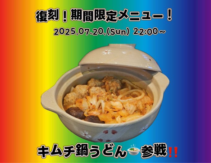 原初を刻むネム・ゼナ👾@nemu_mixloid·7月20日キムチ鍋への投票ありがとうございます🙏🙏✨✨✨✨ マジでこれがいちばん美味いんです❕❕❕❕❕❕❕❕❕❕引用VOCALOID BAR みくすろいど@mixloid_naha·7月20日💚本日22:00~7:00まで💚 👩🍳復刻メニューday🍳 復刻メニューはキムチ鍋焼きうどん‼️ 真夏にキムチ鍋⁉️はさておいて‼️ 期間中に食べられなかった方には朗報⁉️ 7月20日(日)🍲 22時~ 🍥めめ🎤 🔰ゆん 👾ねむ 24時~ 👺てんぐ 🕹️はるすけ 25時~ 🔰ぎろ。 #いんしゅふぁんくらぶ2181,070