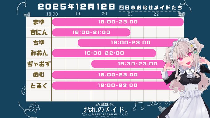 岐阜 Rosera Cafeロゼラカフェ🥀RoseraCafe 岐阜コンカフェ ヴィラン&ダークファンタジーコンセプトカフェ@RoseraCafe·6時間12/12㈮ 変更です🌹 紅愛エンゼル 18:30~21:30 西園寺りさ 18:30~25:00 二色むむ 20:00~25:00 冬菜うーか 21:00~25:00 小清水れい 21:00~25:00 香坂みれい 21:00~25:00 水瀬しずく 21:00~25:00 逢間いの 21:30~25:00引用ロゼラカフェ🥀RoseraCafe 岐阜コンカフェ ヴィラン&ダークファンタジーコンセプトカフェ@RoseraCafe_00·23時間2181