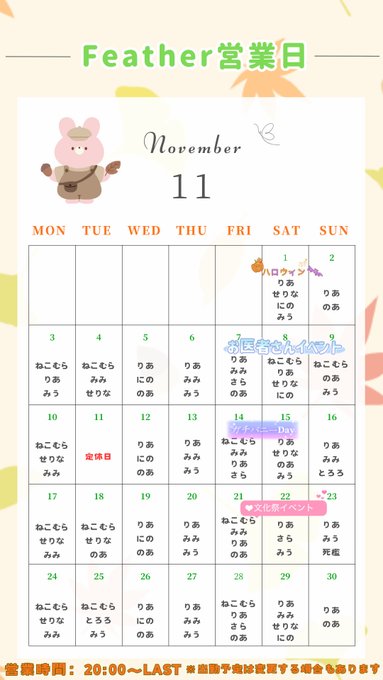 高松・徳島・高知・松山 Feather MOONとろろ@tororon_usagi·11月1日来月は16日、25日にお留守番してます🏠🐇⸒⸒引用Feather໒꒱⋆*高知bunny cafe&bar@feather_bunny_·11月1日·̩͙꒰ঌFeather11月出勤表🐰✨໒꒱ 11月の出勤表です! 7-9 お医者さんイベント💉 14-15 ガチバニー𝐃𝐚𝐲👯♀️ 21-23 文化祭イベント🏮 また、出勤予定は変更になることもあります ご来店のほどお待ちしております! #コンカフェ #高知コンカフェ #バニーガール14232