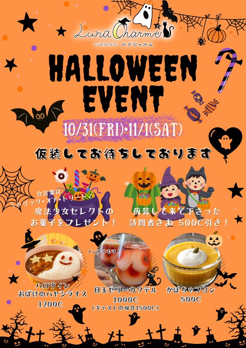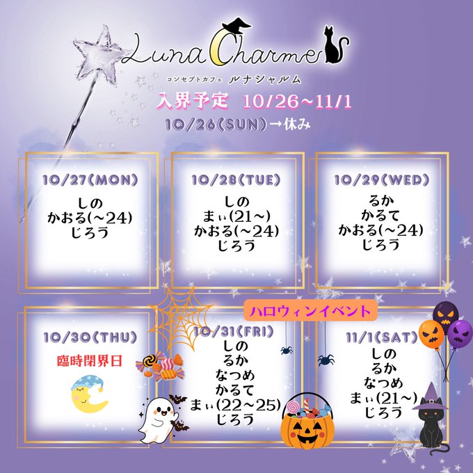岡山 Luna Charme ~ルナシャルム~じろうさんがリポストコンセプトカフェLuna Charme ルナシャルム@LunaCharme·こんばんは!🌛 今週の入界予定表と11月のカレンダーです✨ 今週末はハロウィンイベント🎃 ハロウィン限定フードとカクテル、スイーツも出ちゃうかも!?🦇 仮装して訪問して下さった訪問者様は500C引き! みんなでハロウィンを楽しみましょう!! 今週も訪問お待ちしております💕 #岡山コンカフェ12557