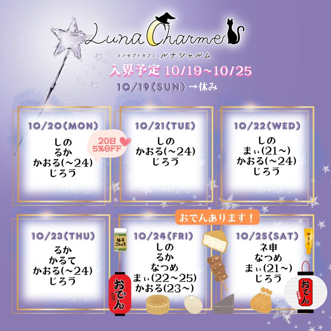 岡山 Luna Charme ~ルナシャルム~じろうさんがリポストコンセプトカフェLuna Charme ルナシャルム@LunaCharme·こんばんはー!🌛 今週の入界予定表です🧙 今週も訪問者様にお会いできるのを楽しみにしております💕 週末はおでんを置きます!具材リクエストも募集しております👍 #岡山コンカフェ13550