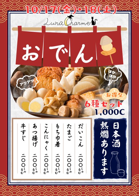 岡山 Luna Charme ~ルナシャルム~じろうさんがリポストコンセプトカフェLuna Charme ルナシャルム@LunaCharme·10月になり段々と涼しくなってきましたね! ルナシャルムでは明日からおでんをはじめます🤤 そしてなんと!おでんがある日は飲み放題メニューに日本酒も追加します!! 熱燗もできますよ♨️ 是非魔法使いちゃんと食べて下さいね! #岡山コンカフェ25546