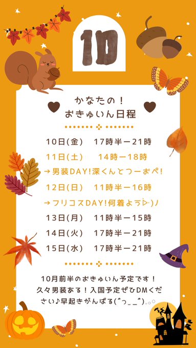 固定かなた🦋ふぇありーめいど@fairy_maid_kana·🦋10月前半のお給仕予定!🦋 遅くなってすみません💦10日からまたおるからねー!しばらくお給仕なかった分全力で頑張る!💪 男装も久々にあるよ!4時間のみの限定開国やから注意⚠️ 🪼くんとつーおぺです🤝17117