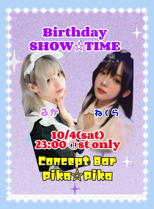 Concept Bar Pika☆Pika@pikapika_0305·🎂10/4(土)🎂 🟣るか生誕祭 ②日目 シャンパン特典有 🟣23:00 ①st のみ Birthday🎂SHOW☆TIME るか&ねくら 👽✕8⤵️ 🟣るか🎂 @Ruka_pikapika つづみ @tuzu_pikapika つむぎ(24時上) ウィズ @withuxizu らむ @rmpikapika ゆるる @pika_yus2 りん @rrin_pikapika Guest☆OG ねくら✨参戦!1128