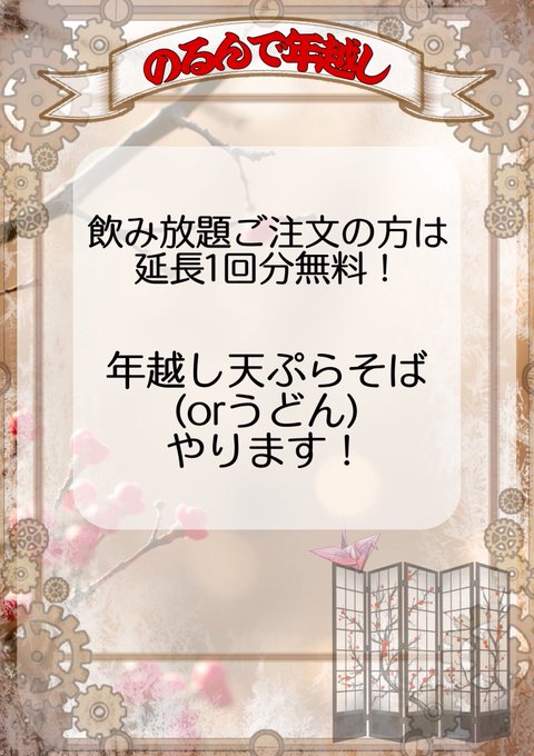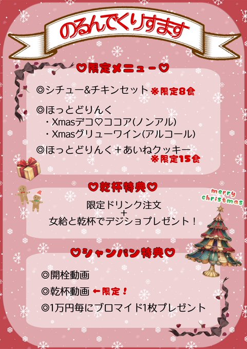 岡山 のるん藤宮さをり💜喫茶のるん@norn_sawori·12月12日クリスマスは限定メニューも特典もたくさん! おうちで家族とのXmas会てきなかんじで、まったりワイワイしましょう(*ˊ˘ˋ*) 年越しも天ぷらそばつくるぞ! ゆっくりしてほしいので延長割引します!引用のるん🫖岡山コンカフェ@norn_okayama·12月12日🕰イベント告知🕰 Xmasイベント:12/24(水)〜12/28(日) 年越しイベント:12/31水曜日 詳しいメニュー等の詳細は追って告知いたします7374