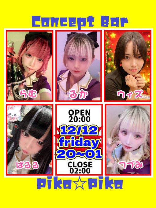 石川・金沢 Concept Bar Pika☆PikaConcept Bar Pika☆Pika@pikapika_0305·👽12/12(金)🚀 店内あったか♨️20時open ⚠️最終入店01:00 今夜の👽⤵️ つづみ @tuzu_pikapika るか @Ruka_pikapika ウィズ @withuxizu らむ @rmpikapika ぱるる @pqr_pikapika お待ちしてます! #コンカフェ #金沢コンカフェ #アイドル #キャスト募集270