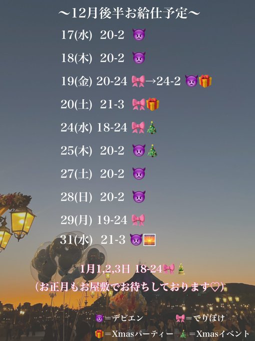 沖縄・那覇 でりしゃすぽしゃけ玉城パンプ💪🏾でりぽけメイド💪🏾@pannpuu_delipo·🎄12月後半のお給仕予定です🎄 イベント盛りだくさんでワクワク🫶🏼! クリスマスもお正月の三が日もお屋敷におります🎅♡🎍 たくさんお給仕できて本当に嬉しいの✨ 年末年始、心も身体も健やかに過ごしましょ😌 (背景は去年の今頃にディズニー行った時の写真!)114145