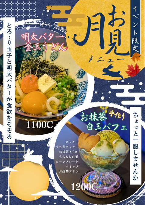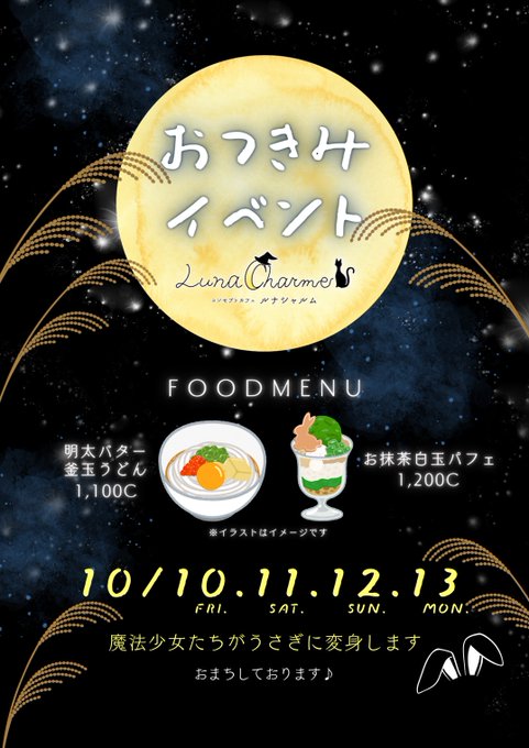 岡山 Luna Charme ~ルナシャルム~じろうさんがリポストコンセプトカフェLuna Charme ルナシャルム@LunaCharme·明日からはお月見イベントです🌕 ルナシャルムでは明太バター釜玉うどんとお抹茶白玉パフェをご用意しております💕 バター薫る明太うどんはお酒とも相性抜群👍 白玉パフェは店長手作りの絶品スイーツになっております🥰 是非食べに来て下さい〜! #岡山コンカフェ24513