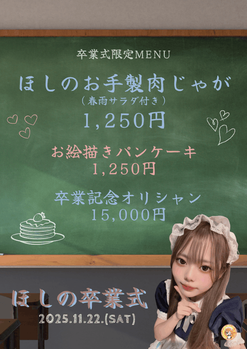 沖縄・那覇 メイドカフェ coffret 沖縄那覇店きらりん@coffret那覇店@kirarin_coffret·5時間肉じゃが美味しそうすぎてキレてる💢引用メイドカフェcoffret沖縄那覇店🌺コフレ@naha_coffret·11時間🌸🌸🌸🌸🌸🌸🌸🌸🌸🌸 〜ほしの 卒業式〜 11月22日(水)19:00〜3:00(L.O 2:30) 🌸🌸🌸🌸🌸🌸🌸🌸🌸🌸 🎓ほしの/みゅん/るる/セナ/むく/きらりん/みこ/よしみて #メイドカフェ #コンカフェ #コンセプトカフェ #バイト #募集 #応募 #沖縄 #那覇3167