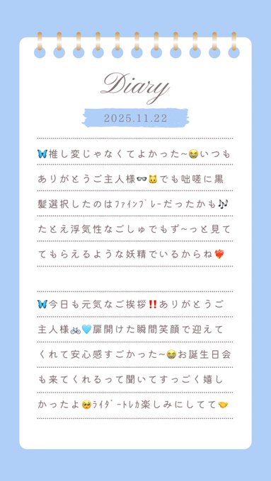 岡山 ふぇありーめいどかなた🦋12/5.6お誕生日会🎂@fairy_maid_kana·🦋かなたおきゅおわ!🦋 してたよー!遅くなりました💦 本日もご入国ありがとうございました!馴染みの皆様!って感じのメンツで安心楽しいお給仕でした⊂( ᴖ ̫ᴖ)⊃🩵 明日は一部おーらす!前後半ビジュ変えようかなあ。悩み悩み( ˘꒳˘)💭 ⬇️写真撮り忘れたから🦄と行ったカラオケの写真🎤13131
