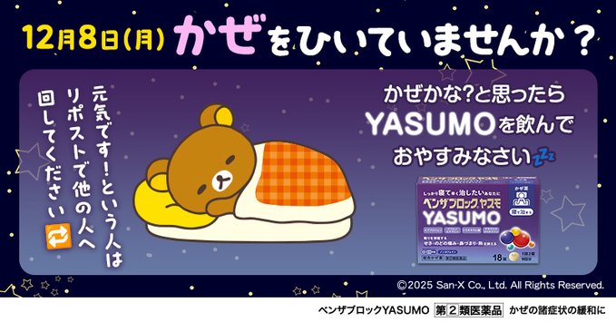 岡山 DollRose黒米 みちる (ンゴ) 🖤🍚🧸さんがリポスト正方形のプロフィール画像ベンザブロック【公式】@benza_jp·🌞ーーーーーーーー🌞 みなさん、かぜひいていませんか? かぜかな?と思ったら #リラックマ のように お休みしてくださいね💤 🌞ーーーーーーーー🌞 【12/8日週】かぜをひいていませんか? 「元気です!」という方は【リポスト】で他の方へ回してください #ベンザブロック健康観察#鼻からくるかぜ気味ですをポスト#のどからくるかぜ気味ですをポスト#熱からくるかぜ気味ですをポスト#せきからくるかぜ気味ですをポスト13163691.5万