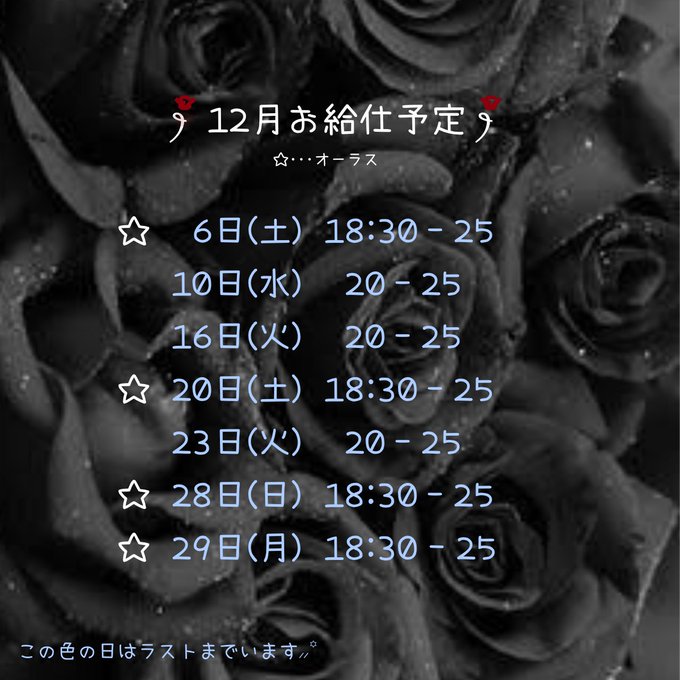 岐阜 Rosera Cafe固定雨月しあ🥀ロゼラカフェ - RoseraCafe - 岐阜コンカフェ@RoseraCafe_16·𓏲𓎨 12月のお給仕予定 𓏲𓎨 12/12 むむちゃん🎂 12/19 めるちゃん🎂 今月は全部ラストまでいます❕🍥 雪が降ったり街の雰囲気だったり色々冬っ!って感じになってきてわくわくだね~♩今年最後を一緒に過ごせたらいいなあ💭お舘でお待ちしてます⋆✦ ※変更の可能性あり5106