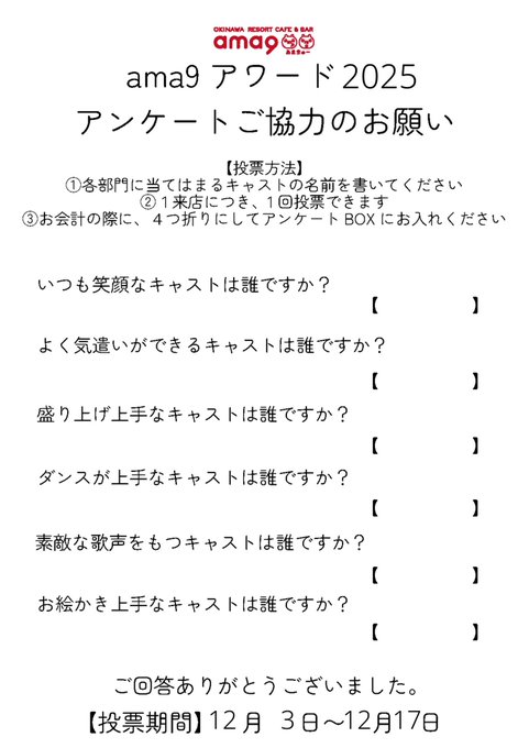沖縄・那覇 OKINAWA RESORT CAFE & BAR ama9クラハ🥀🍼ᩚあまきゅー@kuraha_ama9·3時間あまきゅアワード今日からすたーと‼️ くらは何枠なれるかな\♪♪/ みなさんのご協力よろしくお願いします✨✨💞引用ama9(あまきゅー)【公式】沖縄コンカフェ|キャスト募集中@ama9_official·4時間返信先: @ama9_officialさん①お客様投票 ②運営、キャスト投票 ③スペシャルメニュー実績(2024/12/10〜2025/12/9) 上記3部門で表彰します🏆 各部門の総合1位(合計3名)にチョーカー飾りをプレゼント🌺 お客様投票のアンケートは昨年に引き続き画像の内容となります❕ 是非投票をよろしくお願いします🗳️ #あまイベ5249