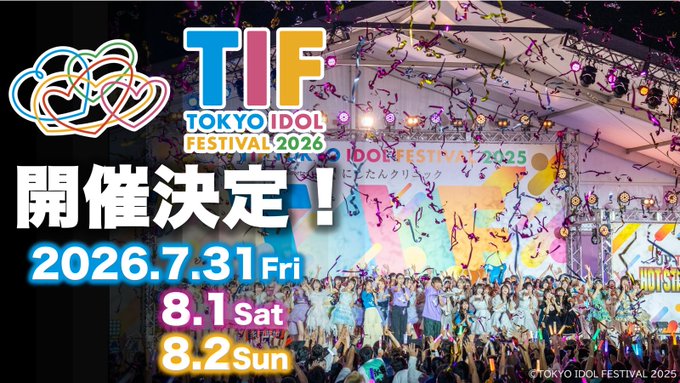 沖縄・那覇 OKINAWA RESORT CAFE & BAR ama9メイリン🩵✨あまきゅーさんがリポストTIP&TIF 公式@TIP_TIF_staff·🎉✨ #TIF2026 開催決定! ✨🎉 来年16年目を迎える「TOKYO IDOL FESTIVAL」の開催が決定いたしました! 📅 2026年7月31日(金)/8月1日(土)/2日(日) 詳細は今後、続々と発表していきます。 お楽しみに🌈✨ 🔗 https://official.idolfes.com/s/tif2026/131,6704,35424万