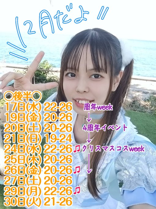 沖縄・那覇 OKINAWA RESORT CAFE & BAR ama9メイリン🩵✨あまきゅー@meiling_ama9·12月🎄メイリンのいる日🩵✨(後半戦) 🎤定期ステージ♫ 24日(水)22:00☁️ 26日(金)21:00🌸 29日(月)22:00☁️ 一緒にお酒飲めるよ🥂の日 19日(金) あまきゅー4周年当日🎂 20日(金) 4周年イベント🎉 21日(土) 4周年イベント🎉 25日(木) クリスマス🎄 🎂BIRTHDAY🎂 24日 IV(Full Throttle4)244