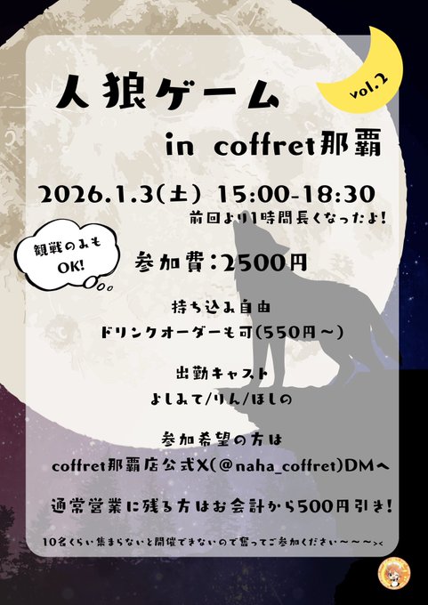 沖縄・那覇 メイドカフェ coffret 沖縄那覇店よしみて@coffret那覇店@yoshimite_c·6時間年明けのイベント告知をする時期になっちまった〜〜〜⛩️✨ 第二回目の人狼ゲームイベントです🌕 またもや人数集まらないと開催危機なので何卒よろしくお願いします🙇 ほしのちゃんも限定復活だよん🌟 今回は私もプレイヤーとして参加した〜い🫶引用メイドカフェcoffret沖縄那覇店🌺コフレ@naha_coffret·7時間🌙🌙🌙🌙🌙🌙🌙🌙 人狼ゲームinコフレ🐺vol.2 1.3(土)15:00-18:30 2500円 🌙🌙🌙🌙🌙🌙🌙🌙 新年から人狼やろ〜〜🐺 前回より1時間長くなりました👏 卒業生ほしのも限定復活❣️ 参加表明はDMもしくは店頭でよしみて/りん へお伝えください🙏 ご質問もお気軽にどうぞ💌 #人狼3356
