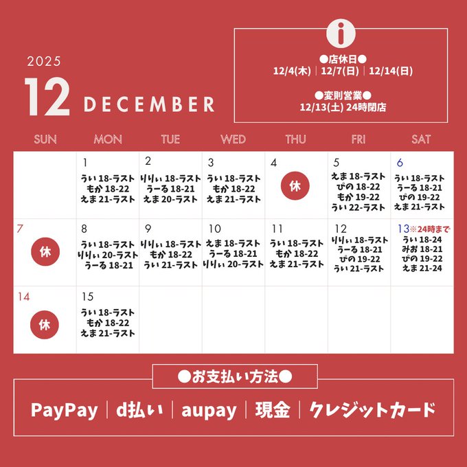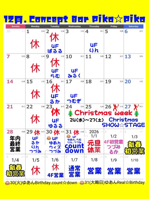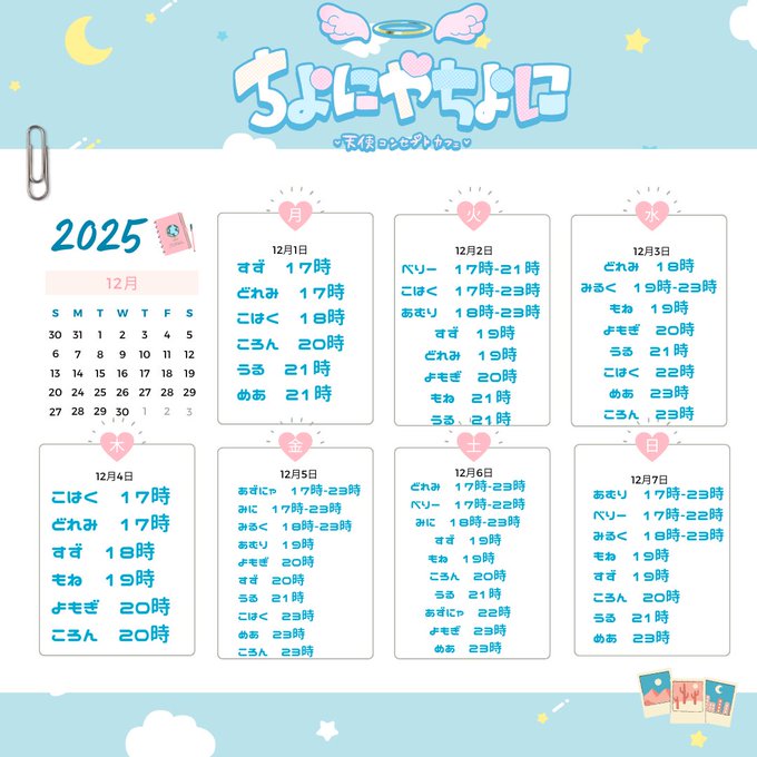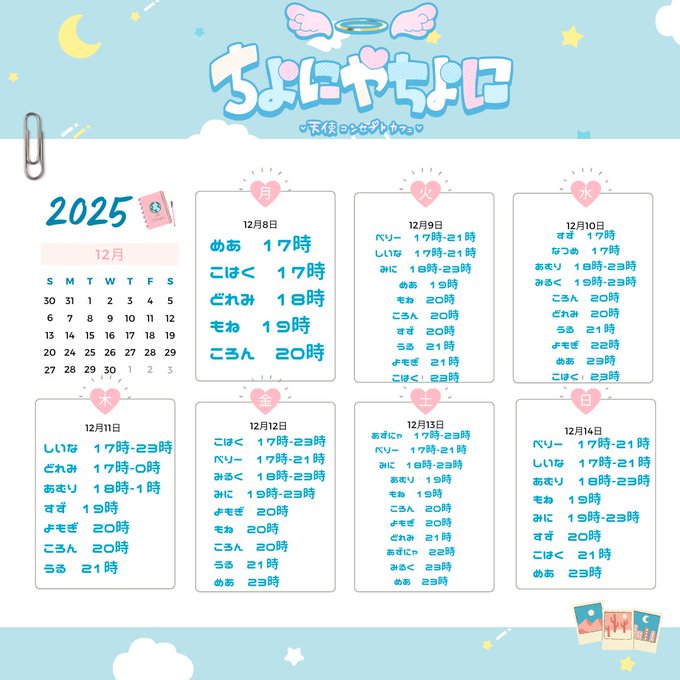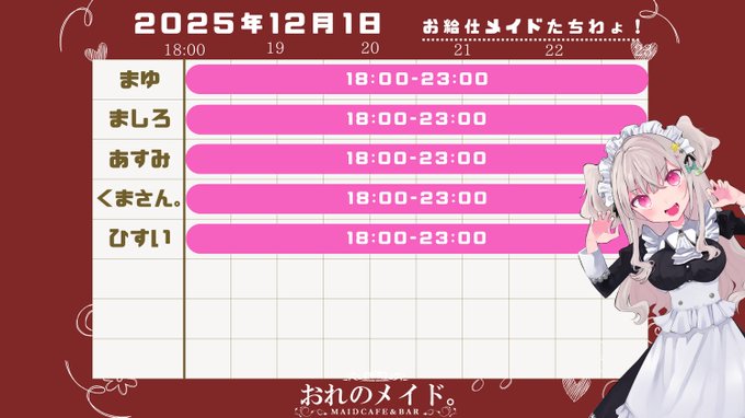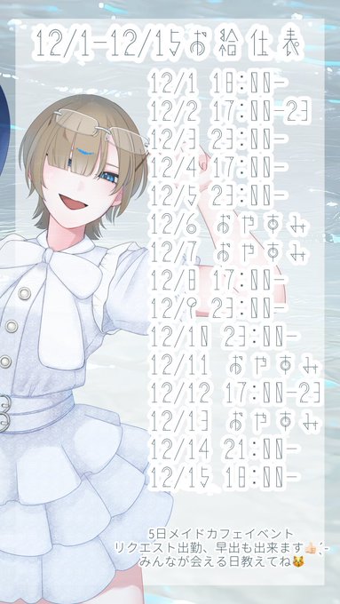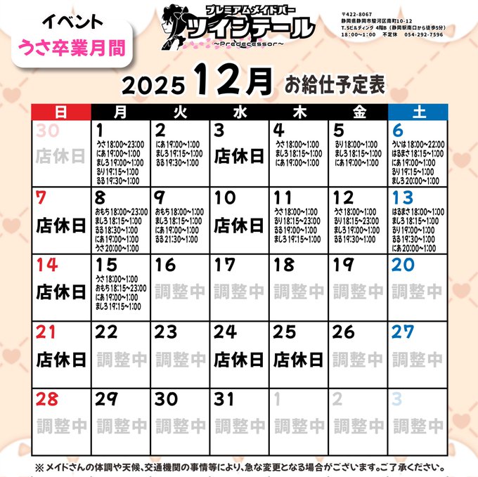 静岡・浜松 プレミアムメイドバー ツインテールプレミアムメイドバー🌸ツインテール (静岡コンカフェ)@TT_Maid·12月前半のお給仕予定表ですっ!👧✨13143