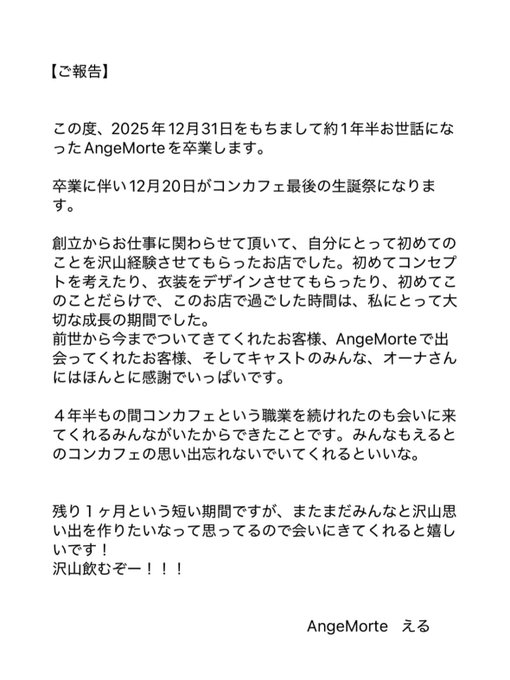 沖縄・那覇 メイドカフェ coffret 沖縄那覇店むく@coffret那覇さんがリポストえる@7x_isclm_o·【ご報告】 2025年12月31日をもちましてAngeMorteを卒業します。 開店から今まで本当にお世話になりました。残り1ヶ月全力でコンカフェ嬢したいのでみんな沢山遊びに来てね🥀12386723.9万
