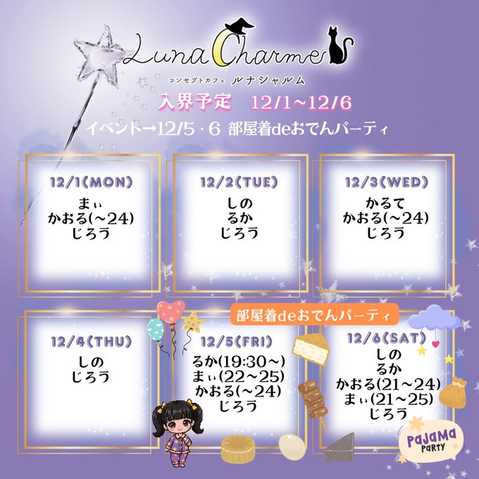 岡山 Luna Charme ~ルナシャルム~固定コンセプトカフェLuna Charme ルナシャルム@LunaCharme·こんばんは🌙 昨日は文化祭イベントに沢山お越し頂きありがとうございました💕 明日からの入界予定表をポストします! 今週末は部屋着でおでんパーティーです!🍢 今週も訪問者様にお会いできるのを楽しみにしております😊 #岡山コンカフェ270