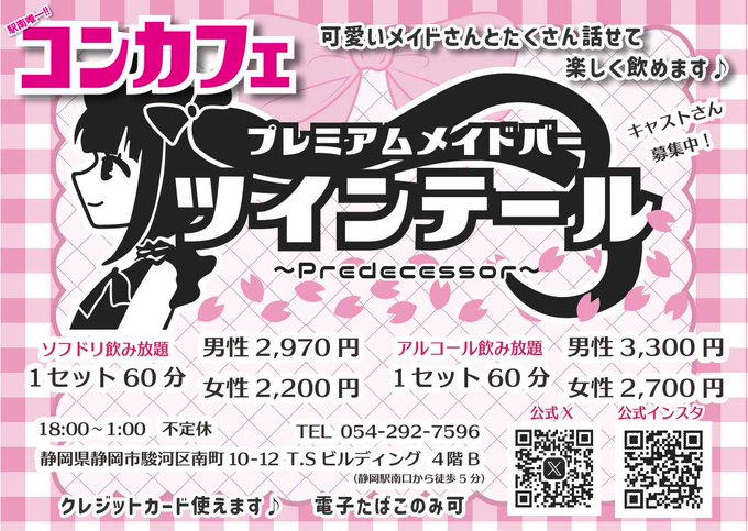 静岡・浜松 プレミアムメイドバー ツインテールましろ🌸ツインテール@mashiro__TT·4時間𝟏𝟎ᴅᴀʏ ʟᴏɢɪɴ ˊ˗ - - - ⑅ - - - ꒰ 🕢 ꒱ 𝟏𝟗:𝟑𝐨〜𝟐𝟓:𝐨𝐨.。໒꒱ ಇ @TT_Maid - ⑅ - ꒰ 🎀 ꒱ ましろろぐいんしましたあ👶🏻🎶 今日はお久しぶり?のちゅいんてです🙂↕️💕 実はカラコンもお初の子つけてます( ᐡ•̥ •̥) 予定ないです泣 遊びに来てにぇᴖ ᴈ ᴖ💘引用プレミアムメイドバー🌸ツインテール (静岡コンカフェ)@TT_Maid·11時間🎀静岡駅南口から徒歩5分!🎀 駿河区南町10-12 T.Sビルディング4階 プレミアムメイドバー ツインテール 🌸1/10(土) 出勤メイド🌸 おもち 19:00~1:00 @omochi__TT にあ 19:00~1:00 @niania_TT ましろ19:30~1:00 @mashiro__TT ご来店お待ちしております👧✨ #静岡 #コンカフェ13138