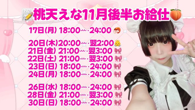 沖縄・那覇 でりしゃすぽしゃけ桃天えな🍑でりぽけメイド@ena_delipo·12時間【各位報告‼️】 俺らのもぎゅちゃん先生をゆっくりお休みにさせるべくこの桃天えな火曜デビエンお給仕させていただきますー🎶💗 ド‼️久しぶりのデビエンちゃんなのであわあわしないようにお給仕がんばります🔥 追加⇒25日(火)20:00ꕀ⋆翌2:00👿 \おいらがいくしかねぇな‼️/引用桃天えな🍑でりぽけメイド@ena_delipo·11月11日📝桃天えな11月後半お給仕🍑 思ってたよりまだ人間界寒くなかったのでお給仕増えたよ気持ちばかり🎶 ふふふ🎶 久しぶりのしゅりぷりさんにもいきます❕ そしてそしてデビエンちゃんにもお給仕するよー🌟楽しみ🥰❕ 🎀⇒でりぽけ 🦐⇒しゅりぷり 👼⇒でりぽけからデビエンに移動3320583