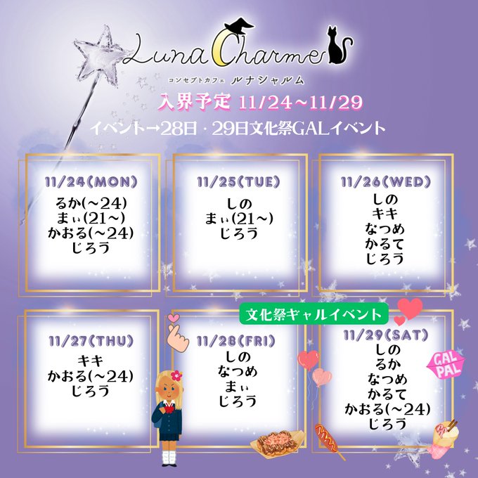 岡山 Luna Charme ~ルナシャルム~固定コンセプトカフェLuna Charme ルナシャルム@LunaCharme·こんばんは!✨ 今週の入界予定表です! 今週末は文化祭イベントです🎪 ギャル姿で皆様をお出迎え👍 今週も訪問お待ちしております🫶 #岡山コンカフェ4108