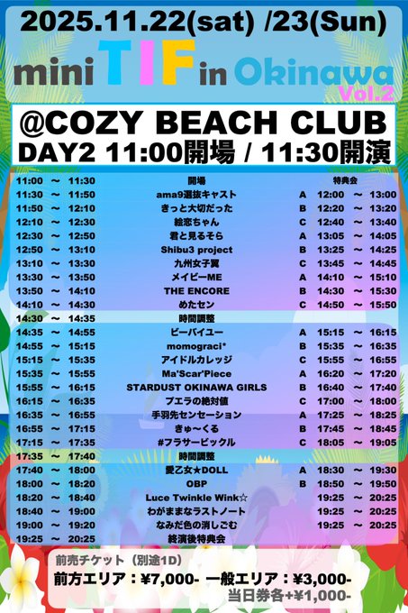 沖縄・那覇 OKINAWA RESORT CAFE & BAR ama9ぷか☁💤あまきゅー@puka_ama9·6時間ミニTIFありがとうございました〜❕ ド緊張と不安もあったけどお客様が皆楽しそうにしてて、踊ってる人の姿見ると嬉しかったし踊ってて楽しかったです🩵ྀི素敵な経験になりました✨ 特典会もありがとうございました~❕お話出来て嬉しい😙 ArcJewel × ama9 コラボ企画も実施中です♪まってま~す🤩💖引用TIP&TIF 公式@TIP_TIF_staff·15時間🌺本日開催🌺 #ミニTIF in OKINAWA vol.2 #ミニTIF in OKINAWA 始まります🌺 11:30〜 #あまきゅー が登場🎤 🎫当日券は現地で発売中🎫 前方8000円一般4000円 💐出演💐 #アイカレ #あまきゅー #OBP #きっと大切だった #キミそら #きゅ〜くる #九州女子翼 #アンコール #シブサン #スタダ沖縄さらに表示16243