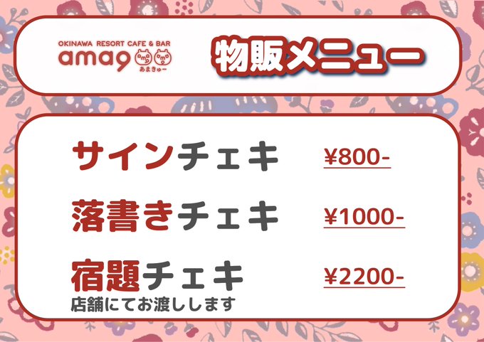 沖縄・那覇 OKINAWA RESORT CAFE & BAR ama9ぷか☁💤あまきゅー@puka_ama9·3時間今日はたくさん楽しみますよ〜❕❕❕ 物販もお待ちしておりま〜す❕ 現金のみらしいです🎀引用ama9(あまきゅー)【公式】沖縄コンカフェ|キャスト募集中@ama9_official·4時間🌺mini TIF 特典会情報‼️🌺 今日の特典会の物販メニュー公開です✨ 宿題チェキのみ、後日店舗へのご来店が必要となります🙇🏻♀️ お支払は現金のみとなりますので、 ご了承ください🙏🏻 特典会は12:00〜13:00で、 場所はAになります! 是非会場でお待ちしております💕 出演キャスト🎤 x.com/ama9_official/…さらに表示15141