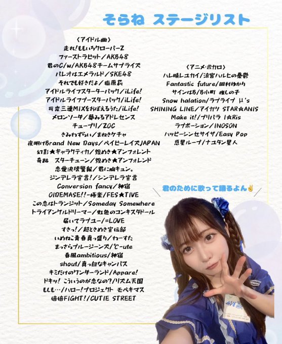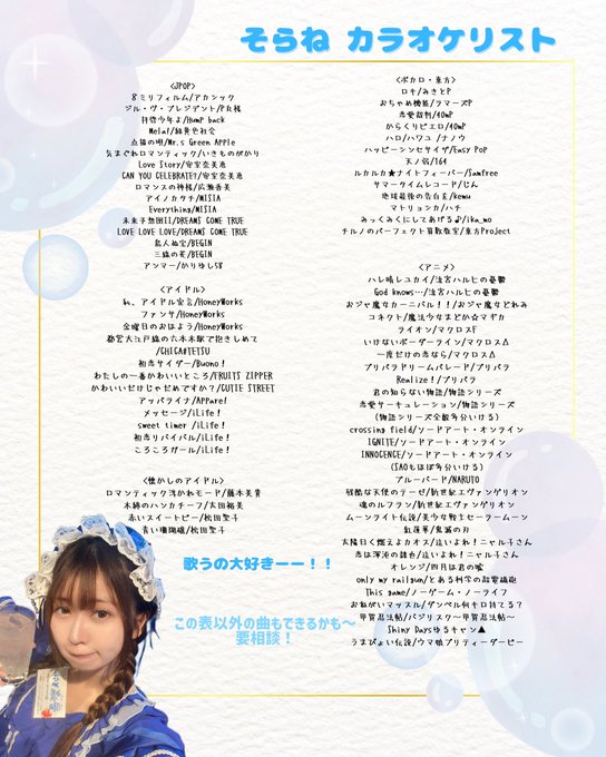 沖縄・那覇 OKINAWA RESORT CAFE & BAR ama9ぷか☁💤あまきゅーさんがリポストそらネキ@あまきゅーゲスト出勤中@sorane_shibuya·8時間ステージリストやカラオケリストはこちらをご参照くださいませ♡引用そらネキ@あまきゅーゲスト出勤中@sorane_shibuya·7月4日現段階でのステージ、カラオケリストです🎤⭐️ いっぱいあるー♡これ踊って欲しいとか歌って欲しいとかあれば言ってくださいな♡ 全曲フルで歌って踊れます、1番だけじゃ物足りない悔しい😭 #歌って踊ってそらねちゃん216521