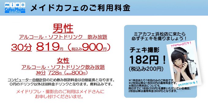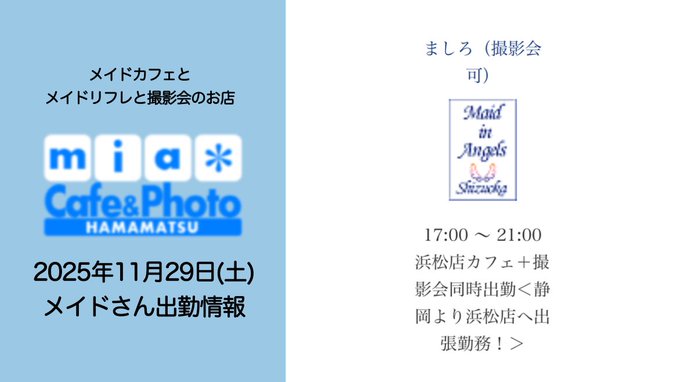 静岡・浜松 メイドカフェ・ミアカフェ静岡店&浜松店&山梨店(2004年創業!)【公式】 静岡メイドカフェ ミアカフェ静岡北口2号店 メイドリフレ 撮影 ミアリラ&フォト静岡北口店@shizuokamaidsan·20時間静岡もやってるけど、浜松店は静岡店のましろちゃんが出張勤務中!引用【公式】 浜松メイドカフェ ミアカフェ浜松店 🌸 メイドリフレ 撮影会 ミアリラ&フォト浜松店@mia053maidcafe·11月29日👑本日11月29日(土)のミアカフェ浜松店 💖17:00〜21:00オープン💖 💖静岡店から ましろ 出張出勤💖 #ロリ #かわいい #メイドさん といっぱいお話しできる #メイドカフェ ☕️飲み放題30分900円 #メイドリフレ #撮影会 10分1000円 ■マップ http://beautybeast.main.jp/mif2/inf10.cgi?mode=main&cno=38… ■道案内 053-540-092012209