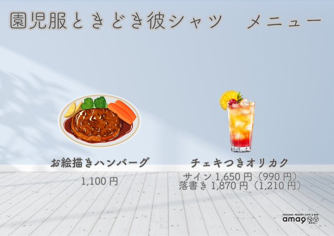 沖縄・那覇 OKINAWA RESORT CAFE & BAR ama9ama9(あまきゅー)【公式】沖縄コンカフェ|キャスト募集中@ama9_official·7時間📛園児服ときどき彼シャツ👔 #あまイベ イベントメニュー紹介💐 ☆お絵描きハンバーグ みんな大好きハンバーグ🤤プラス220円でホワイトソースもかけられちゃいます🎶 ☆チェキ付きオリカク 個性豊かなドリンクをお楽しみください💕 お楽しみに✨引用ama9(あまきゅー)【公式】沖縄コンカフェ|キャスト募集中@ama9_official·11月28日📛園児服ときどき彼シャツ👔 2025年12月2日(火)〜7日(日) ゴーヤカード以上の方限定の店舗アカウントにてアンケートを取った際に人気だった2つのコスプレをしちゃいます✨ カフェタイム☕️ 園児服📛 バータイム🍸 彼シャツ👔 時間帯によってコスチュームが変わります‼️ お楽しみに🌷 #あまイベ15472