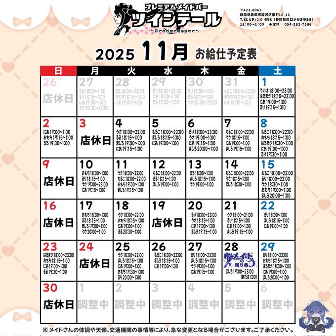 静岡・浜松 プレミアムメイドバー ツインテールプレミアムメイドバー🌸ツインテール (静岡コンカフェ)さんがリポストましろ🌸ツインテール@mashiro__tt·おはようございます𝜗𝜚꙳.* *⑅୨୧ ┈┈┈┈┈ ꒰ 🕗 ꒱ 𝟐𝐨:𝐨𝐨〜𝟐𝟓:𝐨𝐨.。໒꒱ ꒰ 🩷 ꒱ @TT_Maid ┈┈┈┈┈୨୧⑅* 明日は定休日なので本日11月 ラストの出勤日になりますᐡᴗ ᴗᶻ𝗓❤︎ 最後誰に会えるかな〜?って楽しみ にしながらご来店まってみゃす( ՞. ̫.՞)♡13122