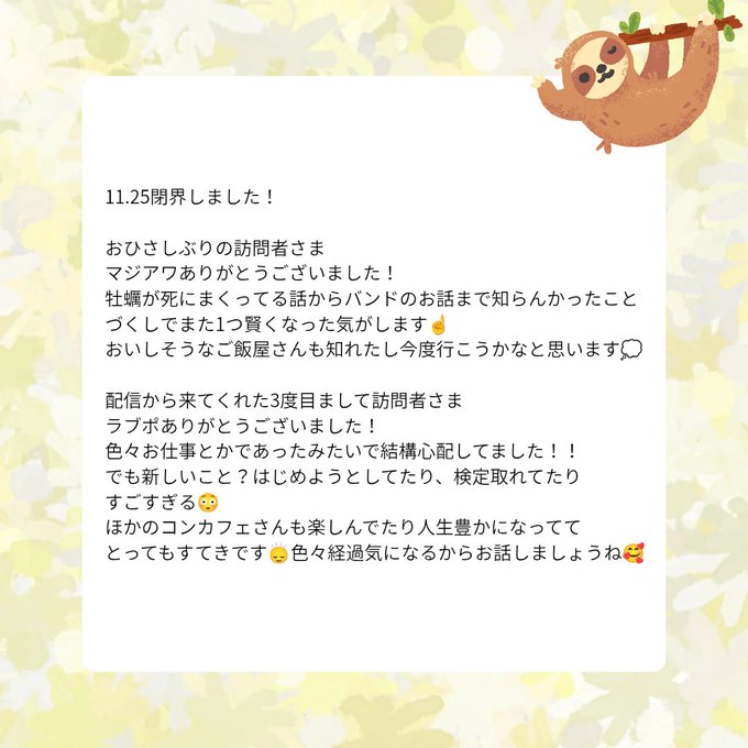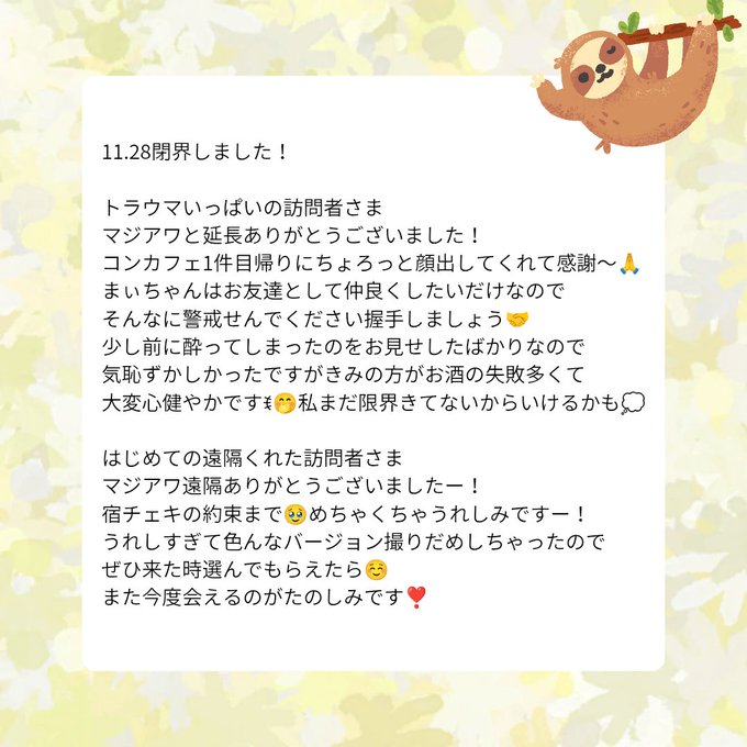 沖縄・那覇 不眠症コンカフェ-キャンスリ-猫羽あむ🐱ྀི@amu_cantsleep·9時間おきゅおわ❕久しぶりごしゅも下で拾ってくれたごしゅも初めましてごしゅもみーんなありがとうございました😭ᩚなんか今日めちゃくちゃ楽しくてテンションばぐってた、入店即テキは効く、やにぶあむなのでやにぶ強くてごめん、、明日もおりますので何卒引用猫羽あむ🐱ྀི@amu_cantsleep·16時間おきゅいん❕土下座界隈です、迎え酒をして楽になりたい気持ちです、華金お待ちしてます❤︎115489