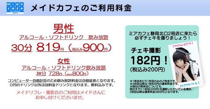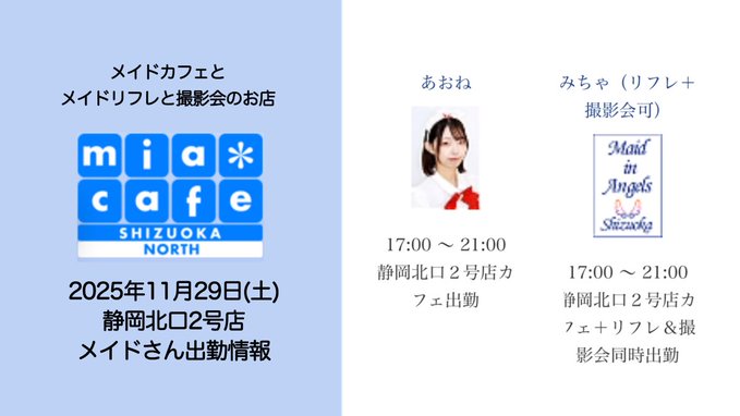 静岡・浜松 メイドカフェ・ミアカフェ静岡店&浜松店&山梨店(2004年創業!)【公式】 静岡メイドカフェ ミアカフェ静岡北口2号店 メイドリフレ 撮影 ミアリラ&フォト静岡北口店@shizuokamaidsan·👑本日(土)のミアカフェ静岡北口2号店 💖17:00〜21:00営業💖 💖あおね・みちゃ 出勤💖 #ロリ #美少女 #かわいい #メイドさん といっぱいお話しできる #メイドカフェ 🍺飲み放題30分900円 #メイドリフレ #撮影会 10分1000円 ■マップ http://egoiste.bambina.jp/mia1/inf10.cgi?mode=main&cno=34… ■道案内 054-330-810012263