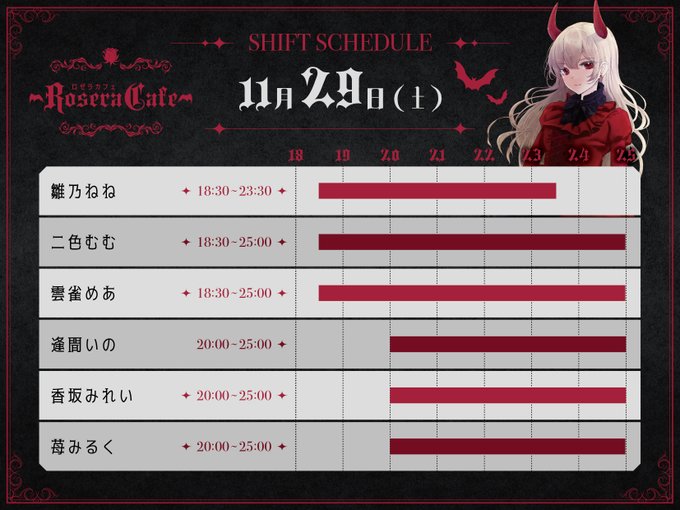 岐阜 Rosera Cafeロゼラカフェ🥀RoseraCafe 岐阜コンカフェ ヴィラン&ダークファンタジーコンセプトカフェ@RoseraCafe·4時間11/29㈯ 変更です🌹 雛乃ねね 18:30~23:30 二色むむ 18:30~25:00 雲雀めあ 18:30~25:00 西園寺りさ 20:00~25:00 猫宮すず 21:00~25:00 苺みるく 21:00~25:00 逢間いの 21:00~25:00 香坂みれい 21:00~25:00引用ロゼラカフェ🥀RoseraCafe 岐阜コンカフェ ヴィラン&ダークファンタジーコンセプトカフェ@RoseraCafe_00·11月28日4122