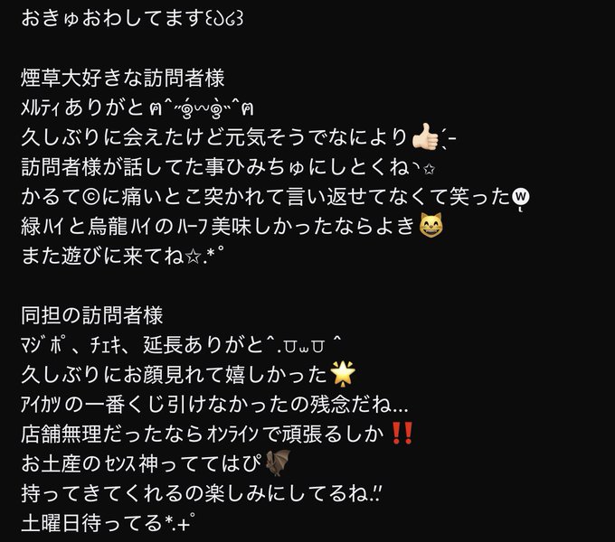 沖縄・那覇 GothicBAR デビル&エンジェル曲角ひだり✝️デビエンメイド@hidari_devi_oki·1時間✝️おきゅいん✝️ 4年配信がなかった推しが電撃復活し 泣きながら配信を見ました、曲角です。 最近推し活が捗りすぎてる✋ 推し語りを、させてください。 うんこミュージアムのお土産ちょっとだけあるので良かったら貰ってネ 今月ラストおきゅ頑張るぞ〜✊✊ #だー活引用GothicBar デビル&エンジェル@devil_angel_oki·9時間😈11月28日(金)20:00〜2:00👼🏻 週末突入〜!!✨ デビエンで乾杯して最高の夜にしよ🦇🍷 🚪本日のお給仕バードル🚪 ⌛️20:00 夢夜しき@shiki_delipo 喜多川うい@ui_delipo 甘音ぴあの@piano_devi_oki ⌛️22:00 曲角ひだり@hidari_devi_oki #コンカフェ #沖縄114226