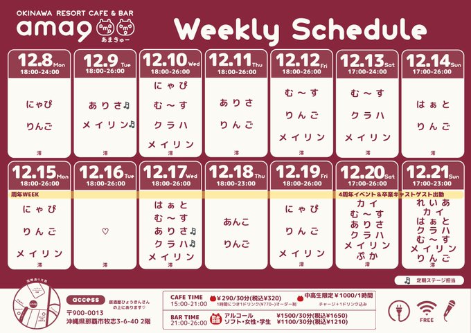 沖縄・那覇 OKINAWA RESORT CAFE & BAR ama9ama9(あまきゅー)【公式】沖縄コンカフェ|キャスト募集中@ama9_official·🌺週間スケジュール🌺12/8(月)〜12/21(日) #あまスケ 15(月) ~ 21(日)🌺周年WEEK🌺 20(土) ~ 21(日)🌺4周年イベント &卒業キャストゲスト出勤🌺 お休み💤なし ♡:体験キャスト *各イベントの詳細は #あまイベ をご確認ください☝🏻さらに表示3153