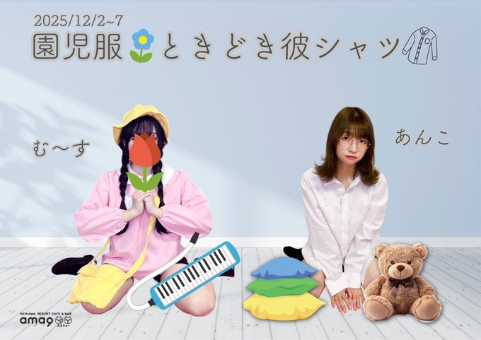 沖縄・那覇 OKINAWA RESORT CAFE & BAR ama9ama9(あまきゅー)【公式】沖縄コンカフェ|キャスト募集中@ama9_official·📛園児服ときどき彼シャツ👔 2025年12月2日(火)〜7日(日) ゴーヤカード以上の方限定の店舗アカウントにてアンケートを取った際に人気だった2つのコスプレをしちゃいます✨ カフェタイム☕️ 園児服📛 バータイム🍸 彼シャツ👔 時間帯によってコスチュームが変わります‼️ お楽しみに🌷 #あまイベむ〜す🧁💗あまきゅーさんと他1人57587