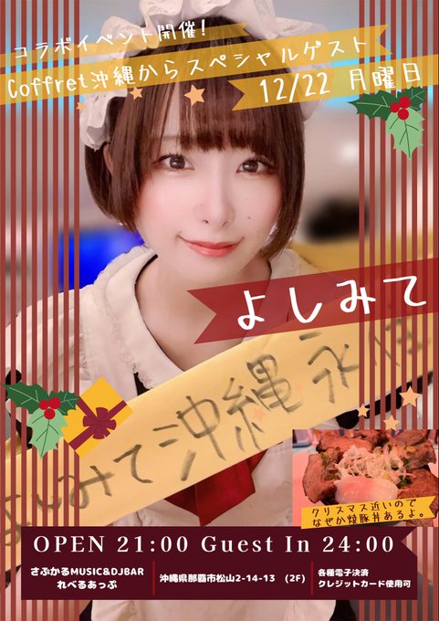 沖縄・那覇 メイドカフェ coffret 沖縄那覇店よしみて@coffret那覇店さんがリポストれべるあっぷ🍬さぶかるDJ BAR@levelupdjbar·【れべるあっぷ情報】 12/22 月曜日 コラボイベント開催🍭 coffret様から 「よしみて」ゲスト出勤💫 @yoshimite_c 詳細はフライヤーを✅ #れべるあっぷ沖縄9121,652