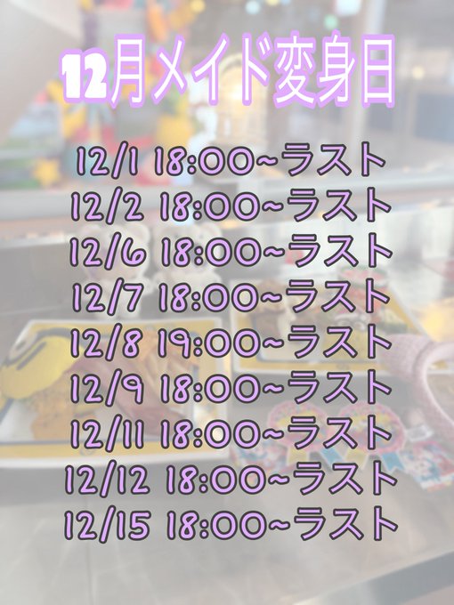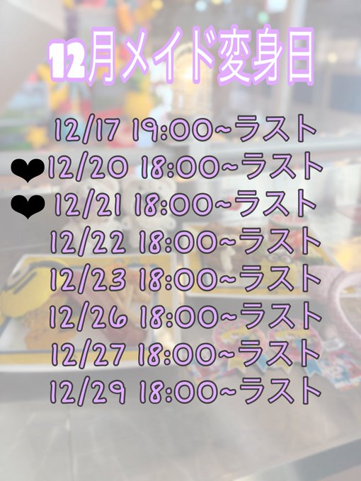 その他中部 おれのメイド四日市固定夢乃💭おれのメイド。@yumeno_oremei·【☃️12月おきゅ日程🎄】 ▼▽▼▽▼▽▼▽ 7日 19:00〜23:00 15日 18:00〜22:00 ほか全部 18:00〜23:00です❕ ほぼ月曜日の人ですが……❕ 週初めお会いできたら嬉しいです🫶 ご主人様・お嬢様のご帰宅を心よりお待ちしております♡86