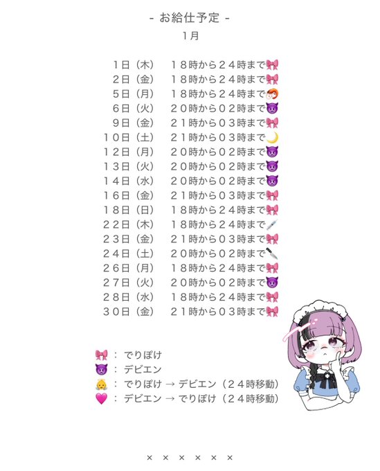 沖縄・那覇 メイドカフェ coffret 沖縄那覇店固定セナ💎coffret那覇店@coffretsena·💎1/10~1/23までのシフト💎 1/10(土)21-3時 1/11(日)19:30-3時🎂りん生誕 1/13(火)21:30-2時 1/16(金)21:30-3時 1/17(土)21-3時 1/19(月)21:30-2時 1/20(火)21:30-2時 1/23(金)21:30-3時8273