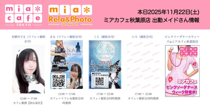 山梨・甲府 メイドカフェ・ミアカフェ山梨店(2004年創業!)まな 秋葉原 メイドカフェ ミアカフェ秋葉原店 + 撮影会&メイドリフレ ミアリラ&フォト東京店さんがリポスト【公式】 秋葉原メイドカフェ ミアカフェ秋葉原店 🌸 メイドリフレ 撮影会 ミアリラ&フォト東京店@mia_group·👑本日(土)のミアカフェ秋葉原店 💖12:00〜22:00営業💖 🍀まな・くら・にろ 出勤 🔰新人 有栖川でる 初お披露目 🩷ピンクナースイベント #ロリ #メイドさん といっぱいお話しできる #メイドカフェ #メイドリフレ #撮影会 ■場所 末広町駅徒歩1分/秋葉原駅7分 千代田区外神田3-7-9 20111402