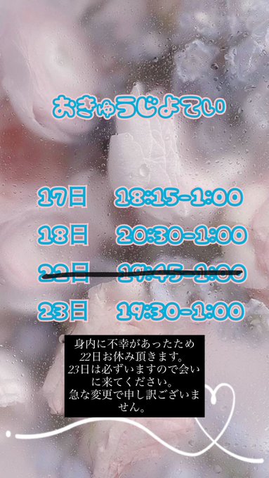 静岡・浜松 プレミアムメイドバー ツインテールるる🌸ツインテール@ruru_ruru_TT·14時間身内に不幸があったため22日お休み頂きます。 急な変更で申し訳ございません。 23日は必ずいますので会いに来ていただけると嬉しいです。引用るる🌸ツインテール@ruru_ruru_TT·11月13日11月後半のお給仕予定です!! 会いに来てほしい!! x.com/tt_maid/status…5106