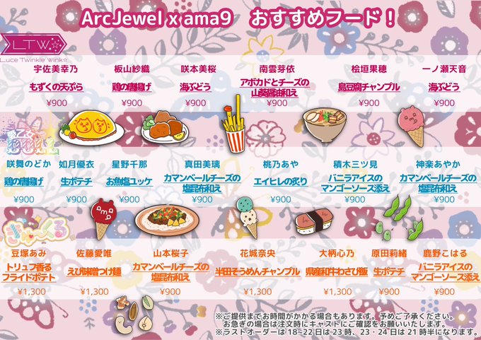 沖縄・那覇 OKINAWA RESORT CAFE & BAR ama9はぁと🤍💙あまきゅーさんがリポストama9(あまきゅー)【公式】沖縄コンカフェ|キャスト募集中@ama9_official·1時間🌺 ArcJewel x ama9コラボ おすすめフード🍽️🌺 あまきゅーの建物1階の本格的な沖縄料理を提供する「居酒屋ひょうきん」のフードがあまきゅーでも楽しめます✨ 各グループのメンバーさんにおすすめフードを教えていただきました❕ 是非コラボカクテルと合わせてお楽しみください🍽️さらに表示Luce Twinkle Wink☆さんと他2人引用ama9(あまきゅー)【公式】沖縄コンカフェ|キャスト募集中@ama9_official·10月28日🌺ArcJewel x ama9コラボ企画決定❕🌺 #あま休 ArcJewelに所属する「Luce Twinkle Wink☆」「愛乙女★DOLL 」「きゅ〜くる」とのコラボが決定しました🎉 コラボ期間中は、ama9店内でコラボアーティストの楽曲やMVを放送🎶17181,735
