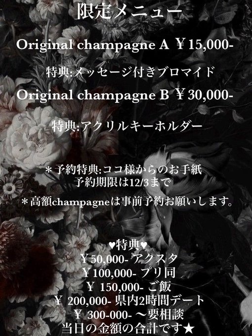 岡山 Aquamere〜あくあめぃる〜🫧*・あくあめぃる・*🫧岡山コンカフェ@aqua_mere·🫧ここ生誕祭🫧 2025年12月20日 🩵営業時間21時〜Last 🍾Original champagne A ¥15.000− (特典:メッセージ付きブロマイド) 🍾Original champagne B ¥30.000− (特典:アクリルキーホルダー) 🫧予約特典:ココ様からのお手紙🫧 ※特典あり※ #生誕祭 #コンカフェ45