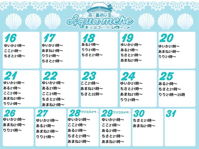 岡山 Aquamere〜あくあめぃる〜🫧*・あくあめぃる・*🫧岡山コンカフェ@aqua_mere·お給仕予定表です🐳♥ #岡山 #中央町 #コンカフェ #マリンコンカフェ14255