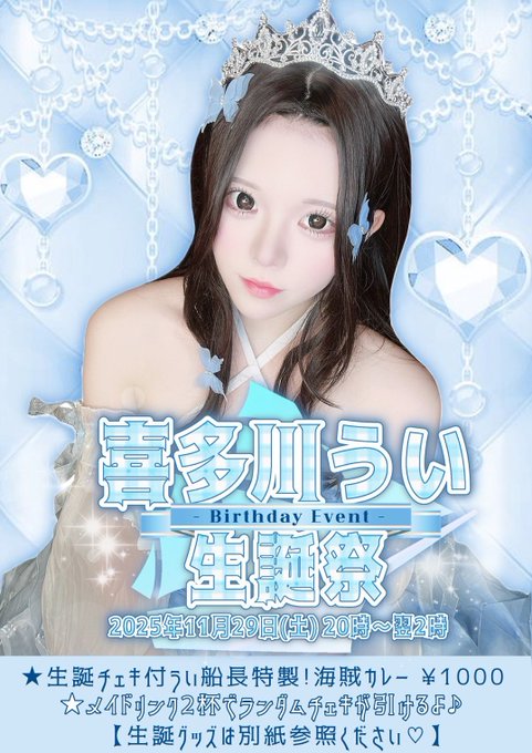 沖縄・那覇 GothicBAR デビル&エンジェル東雲のい🐏デビエンメイドさんがリポスト喜多川うい🔱11/29生誕祭デビエンメイド@ui_delipo·11月後半のおきゅいるです🔱 11月29日(土)は喜多川ういの初生誕! オリシャン予約忘れずに🥹🥹 🎀▷▷でりぽけ 🐾▷▷月コス(アニマル) 🎂🔱▷▷喜多川うい生誕祭🎉117138