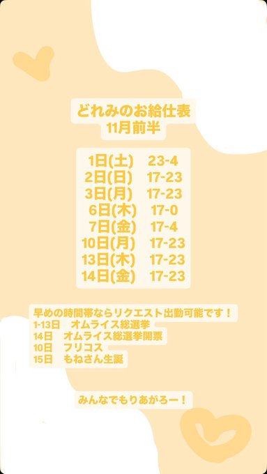岡山 のるん藤宮さをり💜喫茶のるん@norn_sawori·11月5日全体お給仕予定お待たせしました! これは公式w わたしはだいたいいますが、休憩いただいたり中抜けすることがありますのでその際はおしらせします(⋆ᴗ͈ˬᴗ͈)”引用のるん🫖岡山コンカフェ@norn_okayama·11月5日🫧🫖のるん女給のお給仕予定表☕️ お食事メニューのお報せは前日〜当日朝までお待ちくださいませ。 初お給仕の新人女給もおりますため、温かい目で優しく見守ってくだされば幸いです。なにかあればプロデューサーまでお伝えください。 客人様方のご来館を心よりお待ちしております(⋆ᴗ͈ˬᴗ͈)”1141,134
